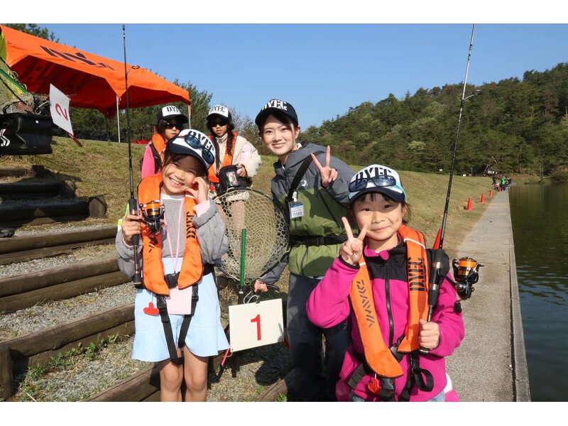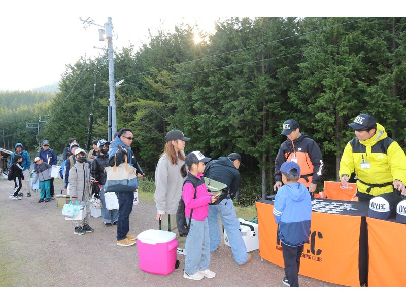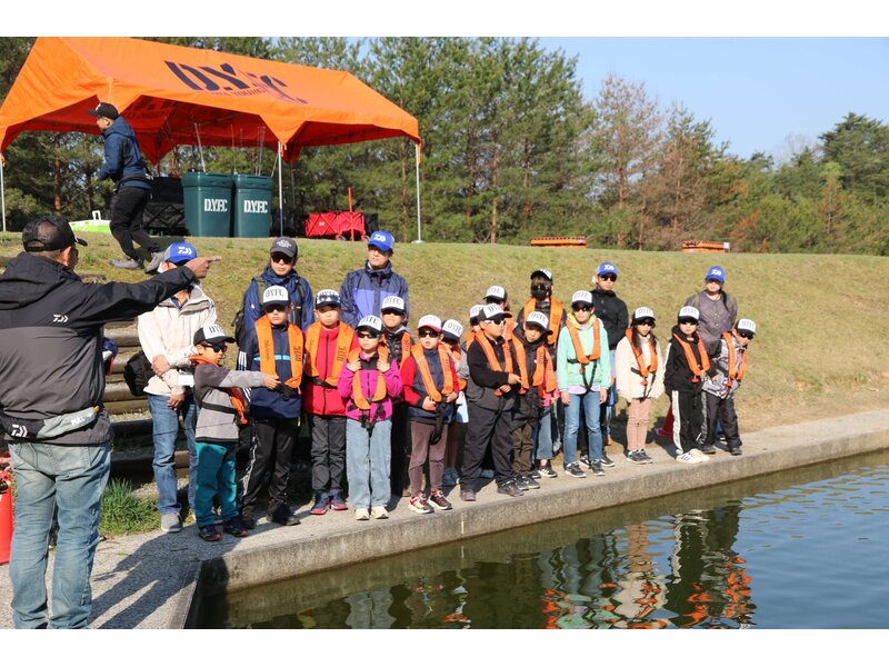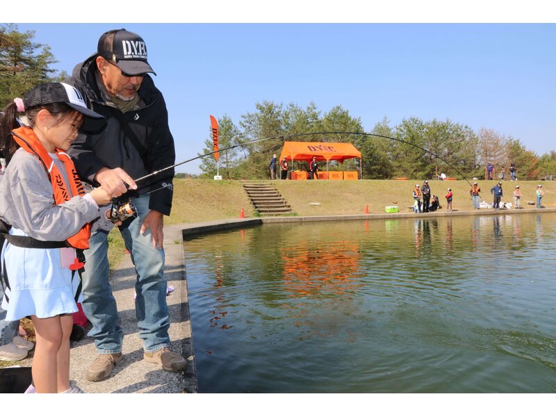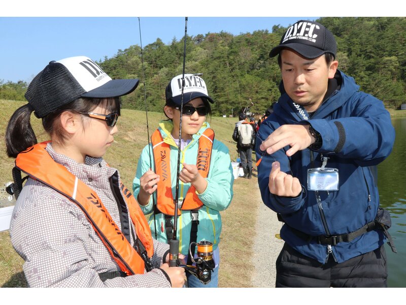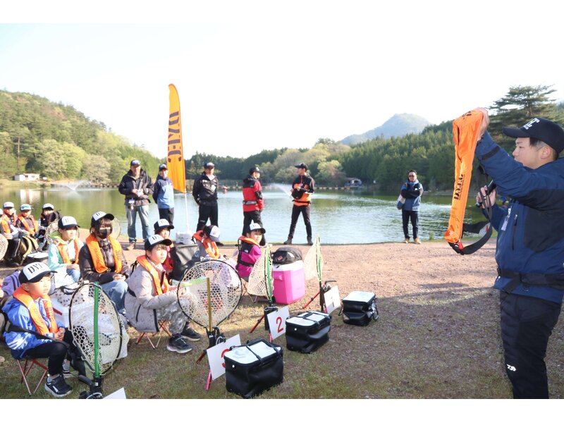 開会式を終えた参加者たちは、トラウトマスター・高田達也プロから釣り方の基本とコツを学ぶため、ポンドへ移動。まずはキャスティングとスプーンを使った探り方を習得し、班ごとに釣り場へ移動し、タックルのセッティングを開始しました。