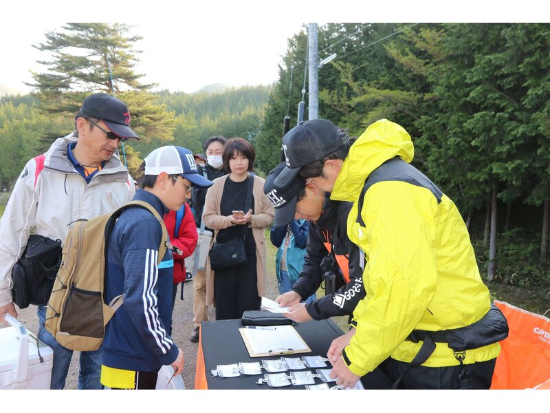早朝3℃の寒さにも関わらず、参加者は集合時間前にほぼ全員集合。熱気に包まれた会場は寒さを吹き飛ばしました。受付後は、安全を第一に、全員にオリジナルライフジャケットを着用してもらいます。