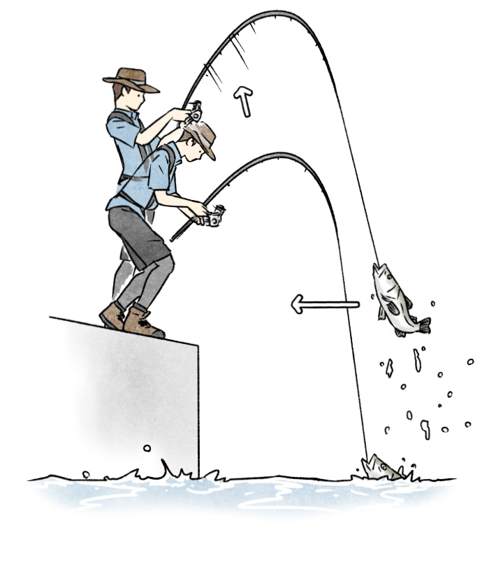 魚がヒットしたら、直ちにロッドを立てて糸を張り(リールの場合は糸を巻き)、ロッドの弾力がフルに活きるように体勢を整えます。そして、イラストのように魚が右に走ったらロッドを左に倒すようにして、ロッドの弾力を利用しながら相手が弱るのを待ちましょう。