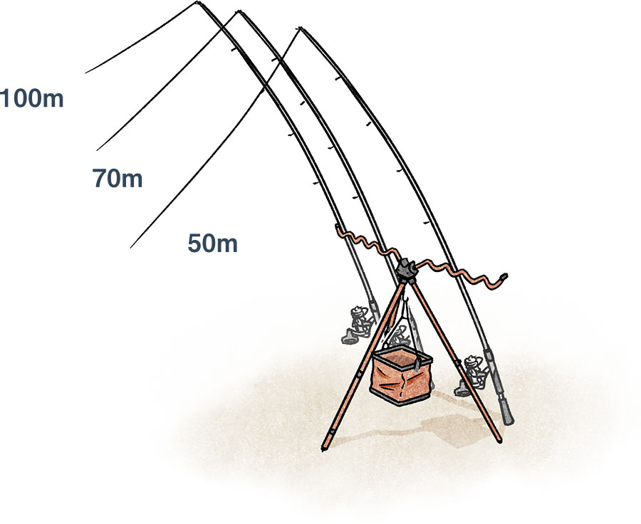 一度に何本かのロッドを出して、距離別に魚を探れば、より早く魚に出会えます。
