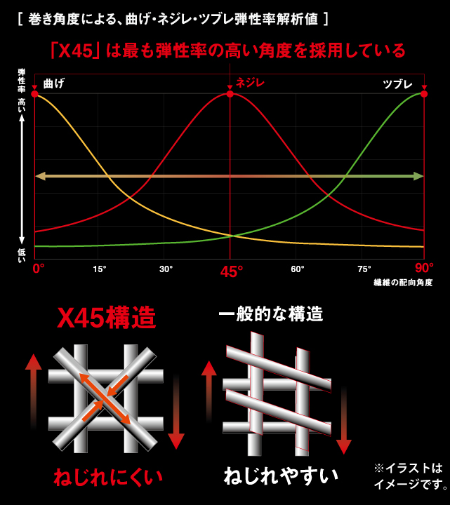 ![]() 「X45」とは、ロッドのネジレを徹底的に防ぐ構造のことである。ロッドに巻き付けるカーボンシートを「X45」という組み合わせにすることでネジレに対して驚くほどの剛性がでるのだ。通常のカーボンロッドの構造は、2種類のカーボンシート(ロッドに対して90度と0度の繊維)を組み合わせて作っている。この組み合わせに、さらにバイアス状(±45度)に繊維を巻きつける構造が、「X45」なのである。いままでは、水の流れや魚の動きなど何らかの力が加わることでロッドがねじれると、カーボンシートの繊維がズレることがあったという。ミクロン単位のわずかなズレではあるが、このズレが操作性やパワーに明らかに影響を及ぼしていたことは確か。ここに45度の格子状の繊維が入ることで筋交い状になり、ロッドのネジレを防ぐのだ。 |
