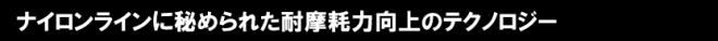 少し詳しく説明しよう。まず、ナイロン分子の間に耐摩耗剤が入り込んで、それぞれの分子結合を強くする。きれいに均等に結合させることがポイント。それが耐摩耗力を向上させるキーとなる。ここまでが『ナノディス300』の技術。『ナノディス1000』は、さらに第3の素材を混ぜ合わせた。第3の素材とは、簡単に言えば分子の結合を強固にする接着剤のようなこと。耐摩耗剤とナイロン分子の表面を溶かしてくっつけるので、より強固に結合させることができ、耐摩耗力がアップするというわけだ。そして第3の素材の混入は、もう一つの利点を生み出した。耐摩耗剤の一部が外側に集まってきたのだ。ラインの外皮に耐摩耗剤の膜ができたような状態になり、さらに擦れに強くなり、なんと滑りさえも向上させた。 |