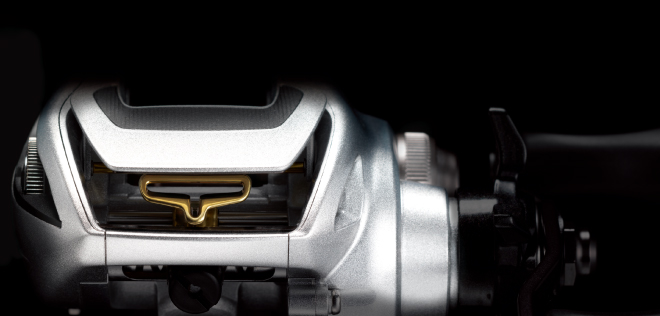 最高飛距離への解決の糸口は、レベルワインドの革新に存在した。それはおよそ25年もの以前に存在したDAIWAベイトリールの名機『ファントム』に搭載された“ゼロフリクション”という名の機構が大きなヒントとなった。キャスト時にレベルワインドが左右へ完全開放され、放出するラインへの抵抗を限りなくゼロへと近づけたあの画期的な機構が、現代の最先端技術によって大幅なブラッシュアップを遂げて搭載されたのだ。その名も“T-ウイングシステム(=TWS)”。ベイトリールの新時代を予感させる、この新たな機構の実力を1つ1つ確認していくことにしよう。 新機構“TWS”の名から想像できる通り、レベルワインドの形状はT型となる“Tシェイプレベルワインド”を選択した。Tの横方向は広いスペースを確保する一方で、タテ方向の溝はごく低く、かつ狭い。この形状が意味するのは、ライン放出時の無抵抗範囲の拡大と、巻き取り時に精密なライン回収を実現することだ。前者はキャスティングポジション、後者はリトリーブポジションとして解説しよう。