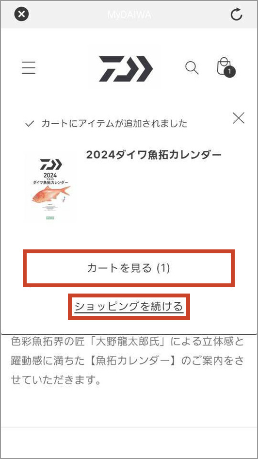 「カートを見る」を選択した後にカート画面で商品の確認を行う。
