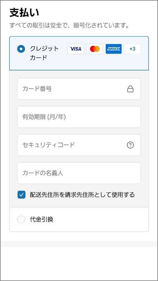 「支払い」方法の選択クレジットカード、もしくは、代金引換を選択する。