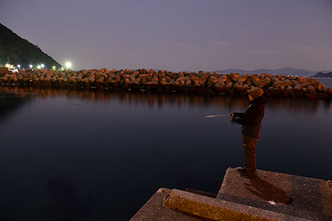 日が暮れて常夜灯が点灯してからがプラグのプライムタイム。点灯してしばらくしたほうが魚の集まりも反応がよい