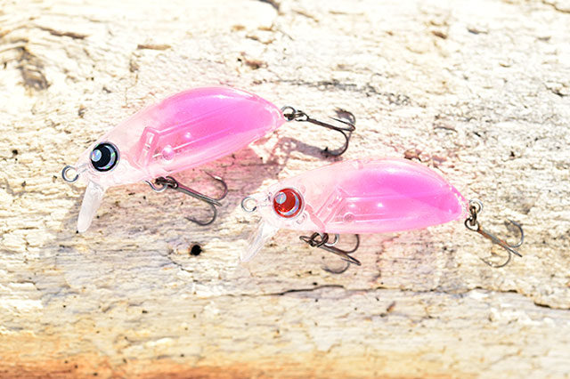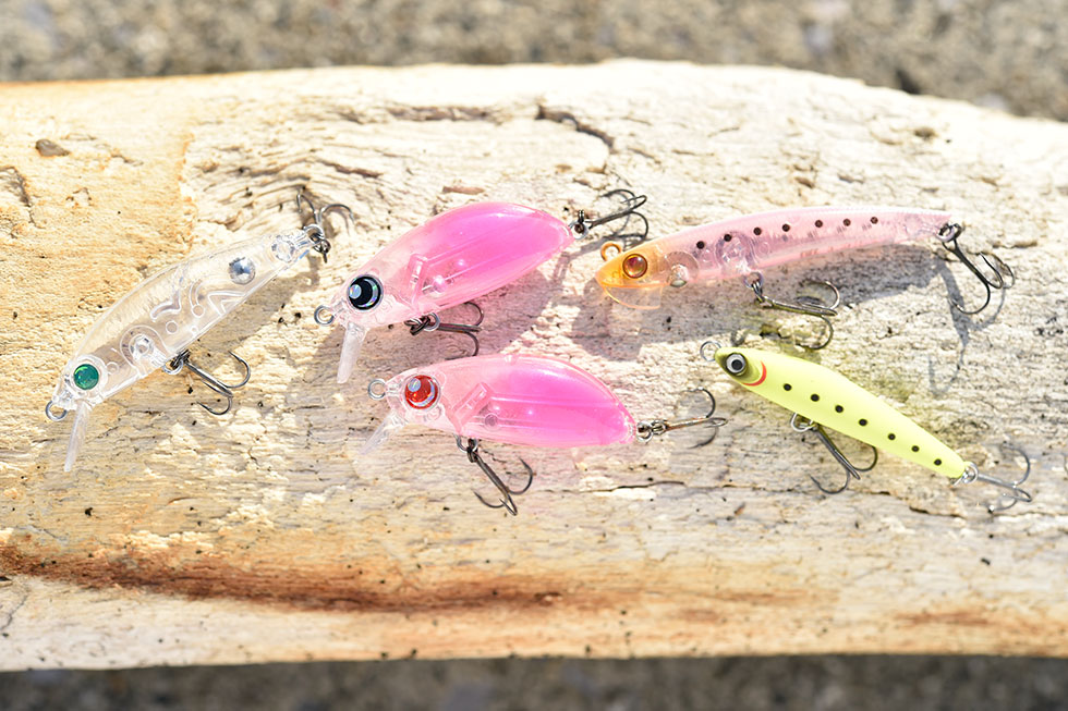 澪示威ソリッドはジグヘッドと同じように扱えるプラグ。さらに、ジグヘッドでショートバイトで終わるときに使うと掛かるようになるケースが多い。同じくスリムな小次郎はフォール姿勢がよく、エギのようになプラグだ。アクションを入れるとダートし、巻くとスッと動く。ストラクチャー周りのピンポイントで決めたいときに最適