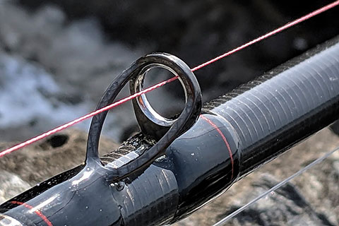 ガイドが軽くなることによりロッドそのモノの重さが軽減され、ロックのようなロッドを立てて釣りをするような釣りにおいて腕の疲れを軽減し、軽くなったことでキャスト時の振り抜きスピードが上がり飛距離が伸びることに繋がります。また、ガイドが軽くなることでキャスト時のティップの「ブレ」の収束が早くなる分、より正確なキャストに繋がります。ロックのようなピンポイントを狙い撃ちする釣りには最適なシステムといっても過言ではないでしょう。剛性はなんとチタンの約3倍。私個人的には軽さもさることながら、圧倒的な「感度」がAGSの特徴だと思っています。