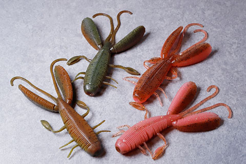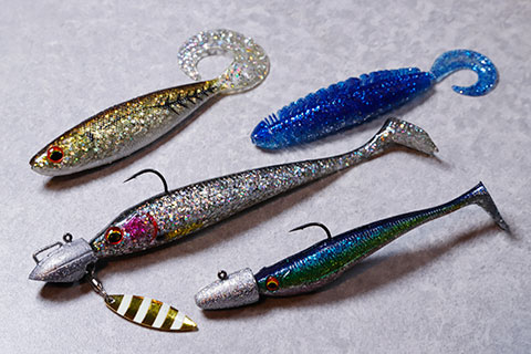 ベイトフィッシュが多い初期はスイミングが有効。テキサスリグでもジグヘッド、プラスブレードなどヤル気のあるアイナメならガップリと食ってくる(左上:KJグラブ、右上:KJカーリー、左下:ダックフィンシャッドR5、右下:ダックフィンシャッドR3.5)