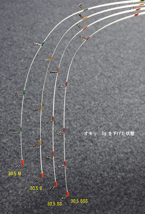 「クリスティアワカサギ胴調子SS30.5」4シリーズ(ガイド干渉の少ないサクサスガイド採用)の曲がりの違い。久保田さん的な使い分けで、SSは競技用。