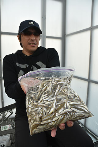 ポイントの水深は大体12~15m。当歳魚の小型の群れを狙うが、釣り人からのプレッシャーによるスレもあり、基本的には食い渋ったワカサギを釣る展開が予想される。