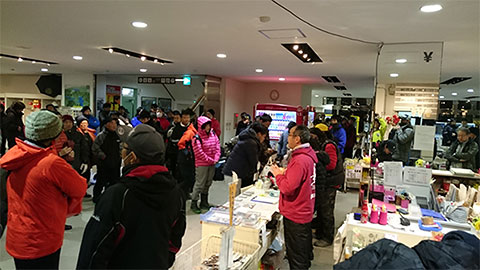 船宿の受付風景(ゴールドハウス目黒)。多くの釣り客でにぎわっている。