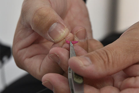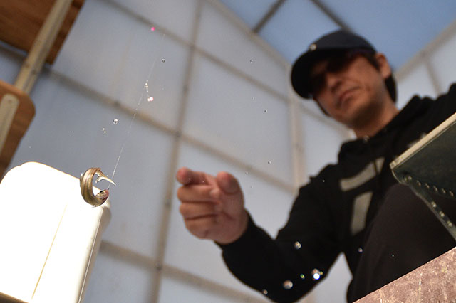 エサはベニサシがメイン。0.5号クラスの小針を使用する時は1/3の大きさにカットする。先端部が極細のピンセット「クリスティアワカサギツイーザー120」を使うと楽