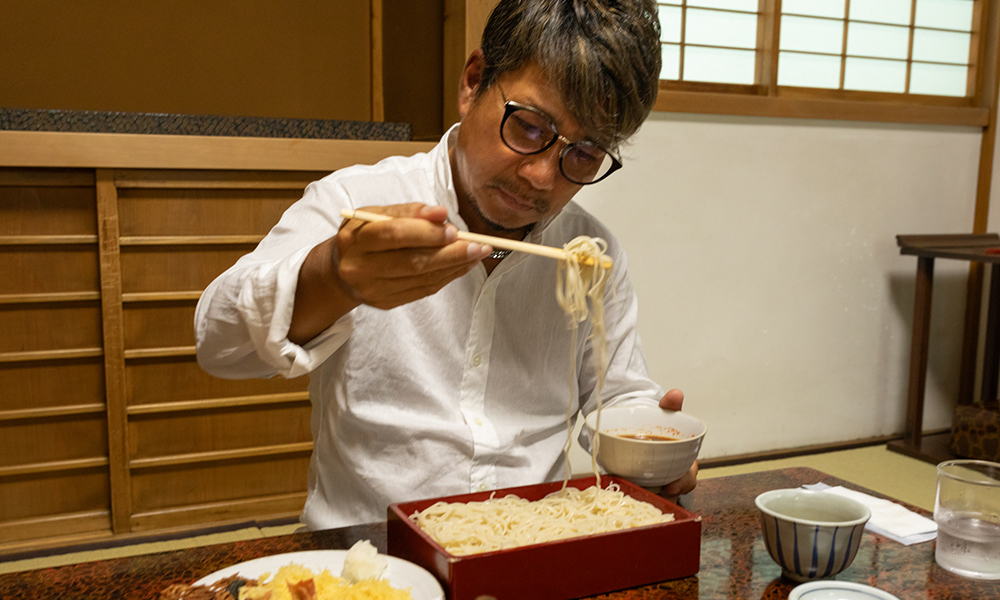 全国の蕎⻨の名店を開拓するのも楽しみのひとつ。「僕の体の90%は炭⽔化物でてきてますから」というほどの麵好き。