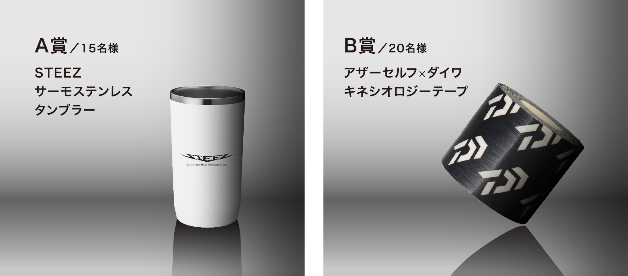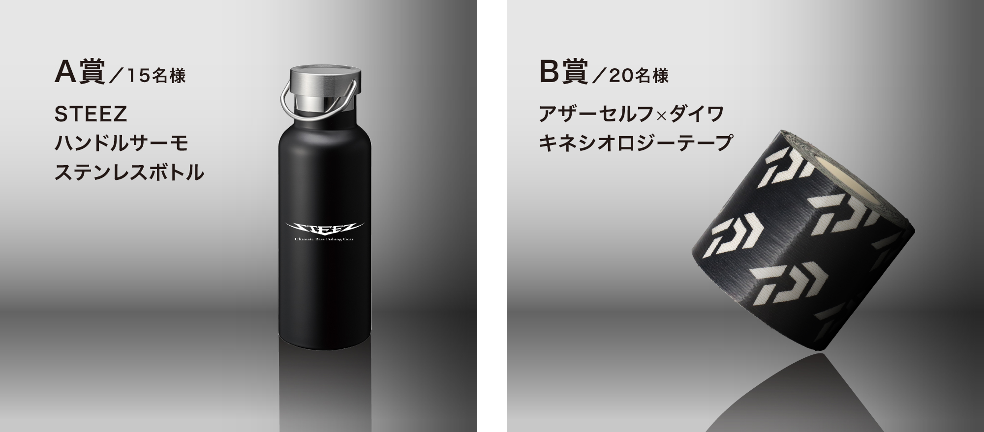 A賞 : STEEZハンドルサーモステンレスボトル 各15名様 / B賞:アザーセルフ × ダイワ キネシオロジーテープ 各20名様