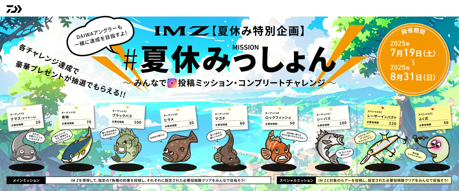 対象の釣果写真とIM Zを、指定のハッシュタグ(「#myimz」「#夏休みっしょん」)を付けてInstagramに投稿してください。