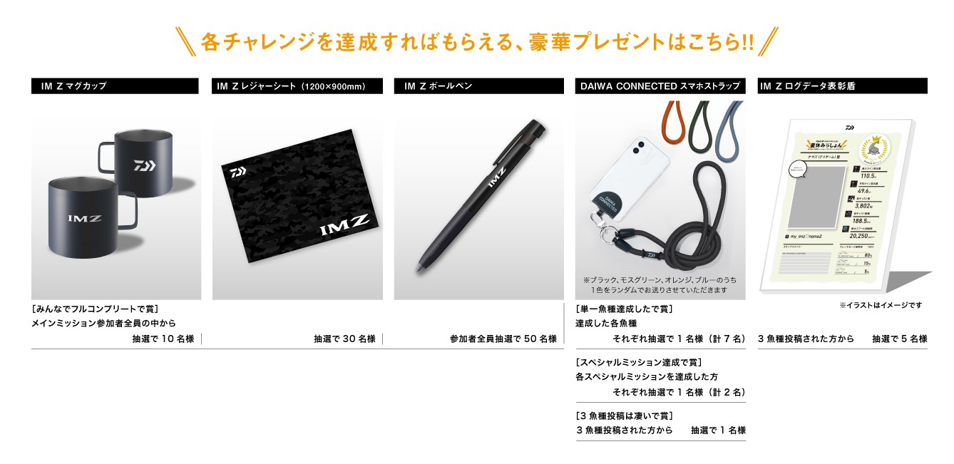 みんなで7魚種コンプリート達成で参加者全ての中から抽選で10名様に「IM Zマグカップ」、30名様に「IM Zレジャーシート」