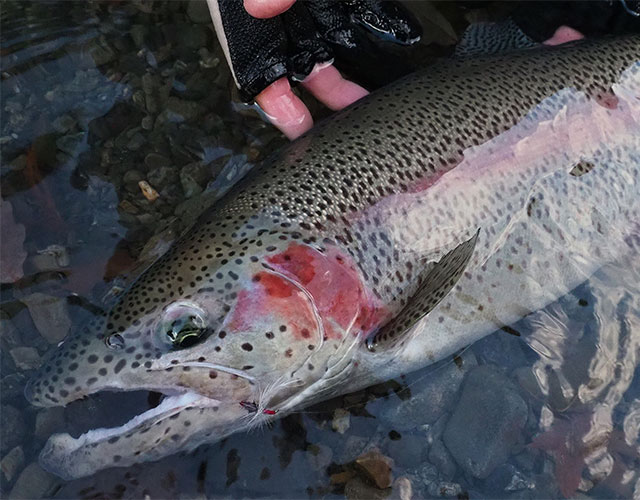 この日は私を含めて20名ほどの釣り人がルアー、フライ、テンカラでハコスチ釣りを楽しんだ。私は途中、組合長へのインタビューもあり(特別編で掲載)、短い時間、毛針を振って挑んでみたが、結果は得られず。だが終了前ギリギリ、魚が水面を意識したタイミングで巨大なハコスチが一度自分の毛針をくわえこんだシーンはしっかりと頭に焼き付けることができた。そして隣で釣りをしていた常連の井出直行さんがテンカラで53cmの立派なオスを釣り上げ、ハコスチとの念願の対面を果たすことができた。