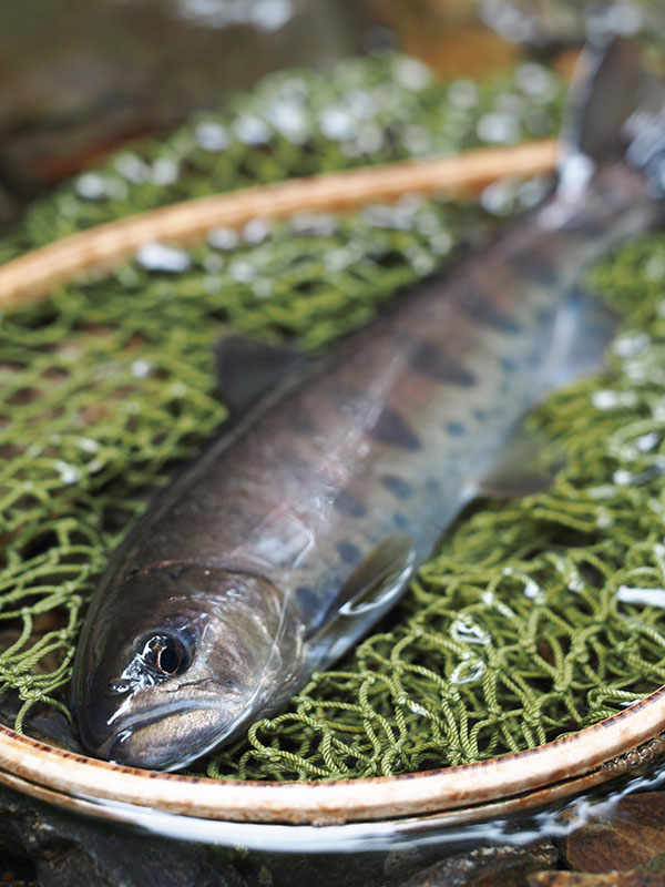 ひとつはロケーションの美しさ。苔むした岩を流れる透き通る水は、頭上に張り出すサワシバやミズナラ、カツラなど広葉樹の緑を映して艶やかなエメラルドグリーンに輝いている。新緑の時期は若葉を通す光で空気までが翡翠色に染まる。さらに、そこで釣れるのは、オレンジ色の斑点を持つ、この川で命をつないだ色鮮やかな野生のイワナだ。