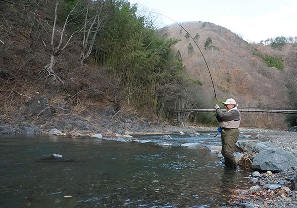 今回、釣りに訪れたのは12月5日。上野村漁協での渓流釣りは3月1日~9月20日までとなっており、9月下旬から2月いっぱいまでは禁漁期となっている。ただ、漁協では「冬にも渓流釣りを楽しみたい」をというニーズに応える形で、本流の限られた区間を川の駅特設釣り場〈期間限定〉ルアー・毛ばり専用区として開放している。対象魚は「ハコスチ」と呼ばれるニジマスだ。ハコスチは、群馬県が長年、継代飼育して作り上げた人馴れした成長のよい「箱島系」と呼ばれるニジマスに、野性味の強いスチールヘッド(降海型のニジマス)を交配させ、引きが強く激しくジャンプもする「釣り味」を持ちながら、しかも育てやすいという特徴をもつニジマスの一品種。釣り場には30cmクラスの銀ピカなものと、黒点とレッドバンドがくっきりと出た50cmクラスの大物が期間中、随時成魚放流される。3月からは、ヤマメとイワナが追加放流され、5月末まで予約制エリアとして楽しめる。期間限定の釣り堀的な管理だから、先に書いたその川での「生い立ちとこれから」の想像を楽しむことはできないが、カッコいいニジマスの容姿を一目見たいと(そしてできれば、その強烈な引き味を味わいたいと)上野村を訪れた。