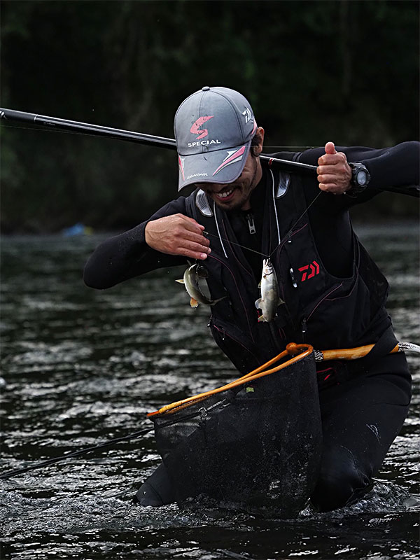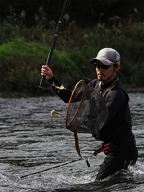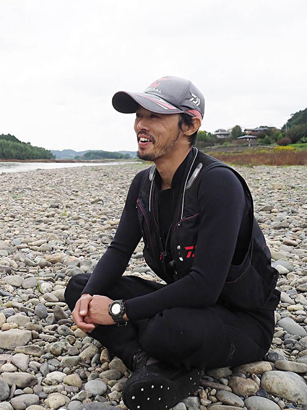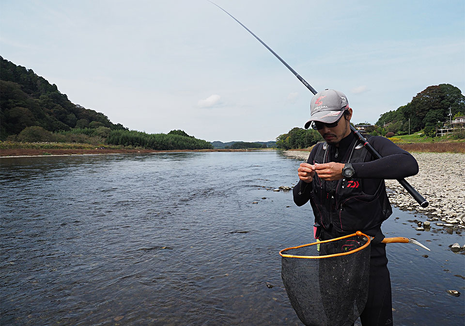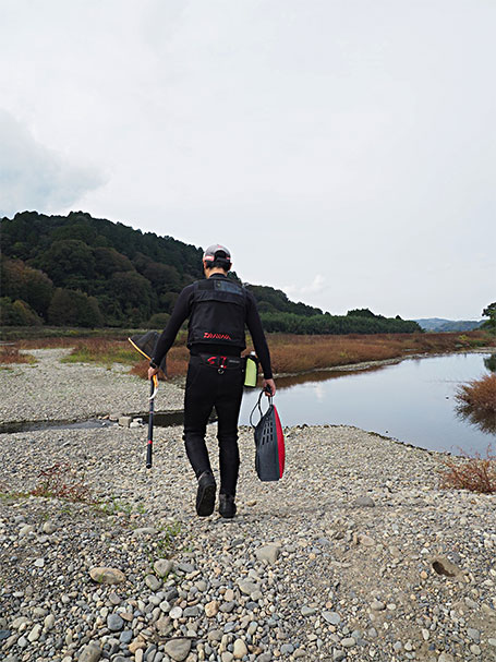 「魚捕りは親父の影響です。うちはひいじいちゃんから農家の家系で、釣りをするのは親父と僕ぐらい。父はアユ釣りも大好きです。小さい頃はマスの釣り堀に連れていってもらったり、家の前の川でフナ釣りをして遊んだりしてました。那珂川の本流に出たのは中学ぐらいから。その頃はバス釣りでした。三陸の大学時代は海でアイナメやソイ釣りばかり。アユやサクラマスは地元に戻ってきてからですね。アユはまだまだ全然なんで、研究中です。この時期は瀬付きといって産卵で集まってくるアユの群れに当たれば大釣りも期待できるんですけどね」。