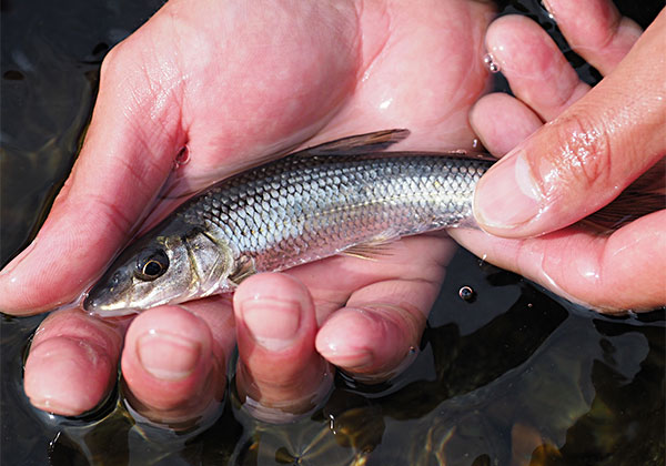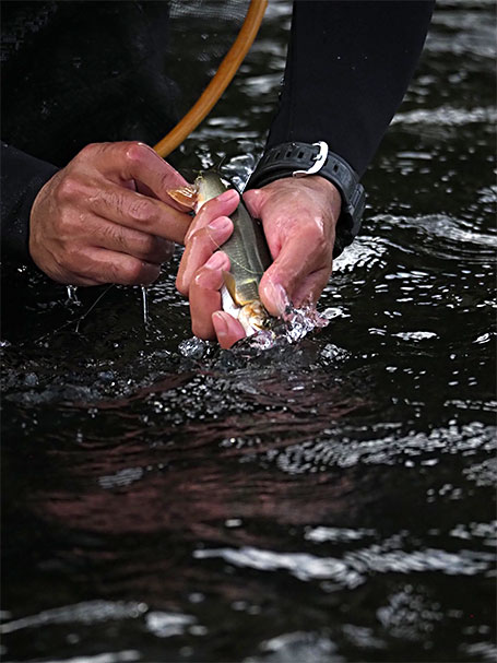 会ってすぐ、橋の上から川の様子を探ると釣り場を定め、「少し遠回りすることになりますが、ダムの方を見にいってもいいですか?」と言う。日々、カワウの群れの様子をチェックしているのだという。カワウは内水面漁業にとっての大敵だ。川に大きな群れが飛来するようになるとアユやヤマメを飽食し、甚大な被害が及んでしまう。その対策は綱川さんの勤めていた水産試験場にとっても大きな課題だったに違いない。