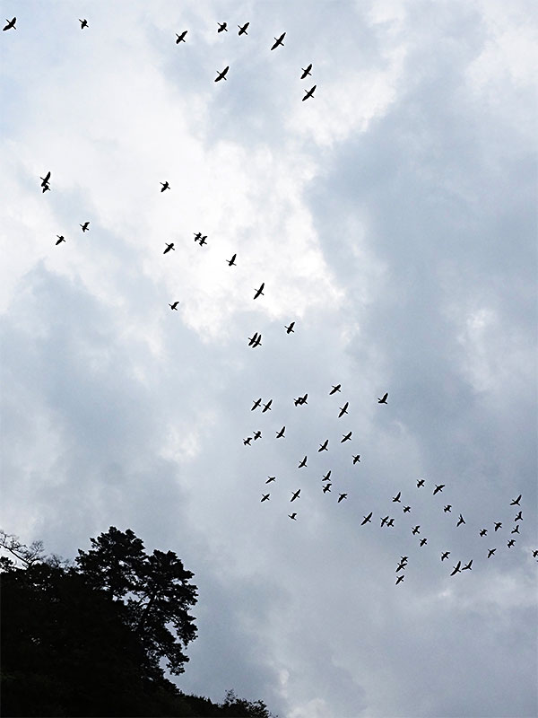 雲の合間から時折日が射し綱川さんを照らす。深い緑色をした押しの強い川の水が、瀬に立つ一本の杭を洗っているようだ。カワウの群れが下流へと飛んでいった。