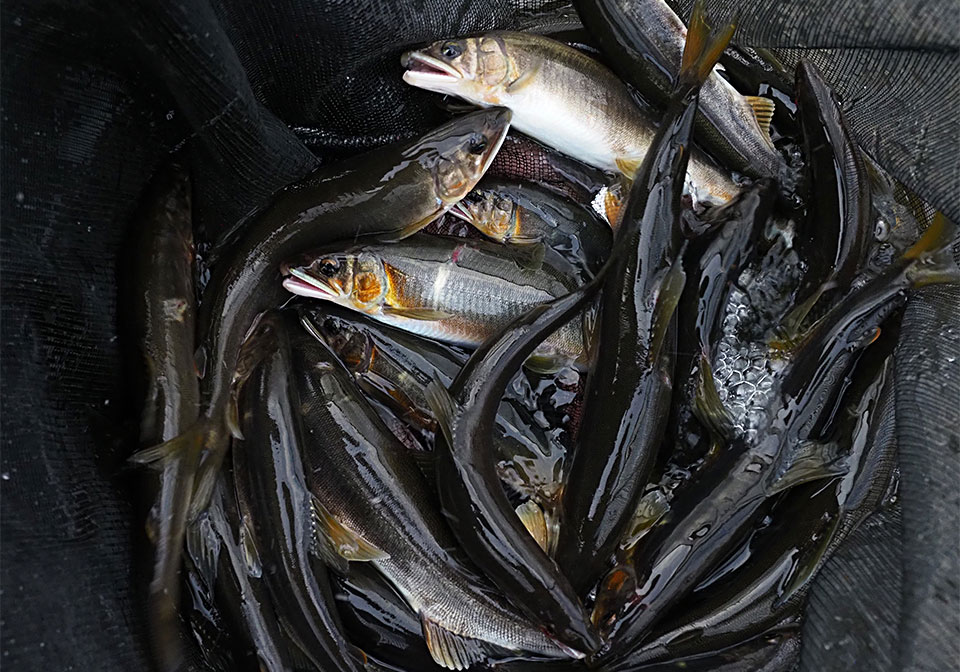 短い時間で20匹ほどかけただろうか。アユは産卵前のいわゆる「落ちアユ」で、金と真鍮と赤銅と灰が混ざったような深い色に背中から黒鉄色が被さっていた。メスは産む前の卵をたくわえ、夏のアユとはまた異なる味わいがあるという。