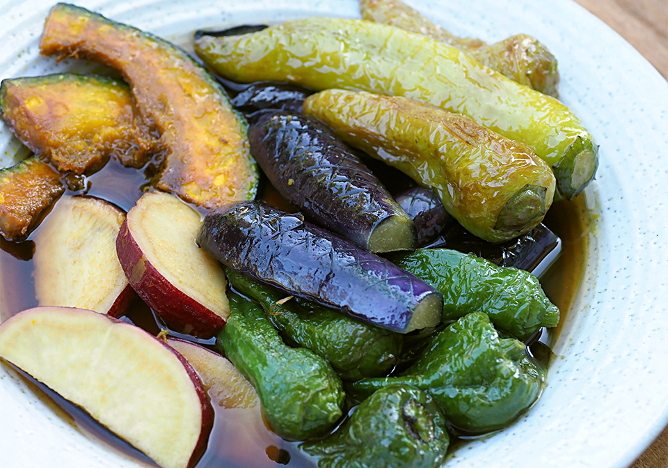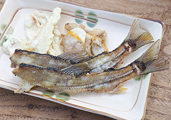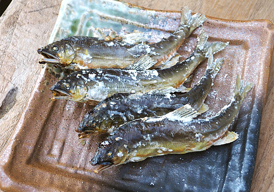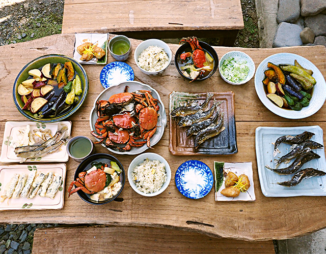 ほかにもアユ飯、アユの天ぷら、骨せんべい、モクズガニの味噌汁、そして実家の畑で採れた野菜の素揚げ。口に入れるもの入れるものが全部美味しい。昨日、川辺で綱川さんが「この辺りにあるもの全部が好きなんですよ」と話していた言葉が蘇る。