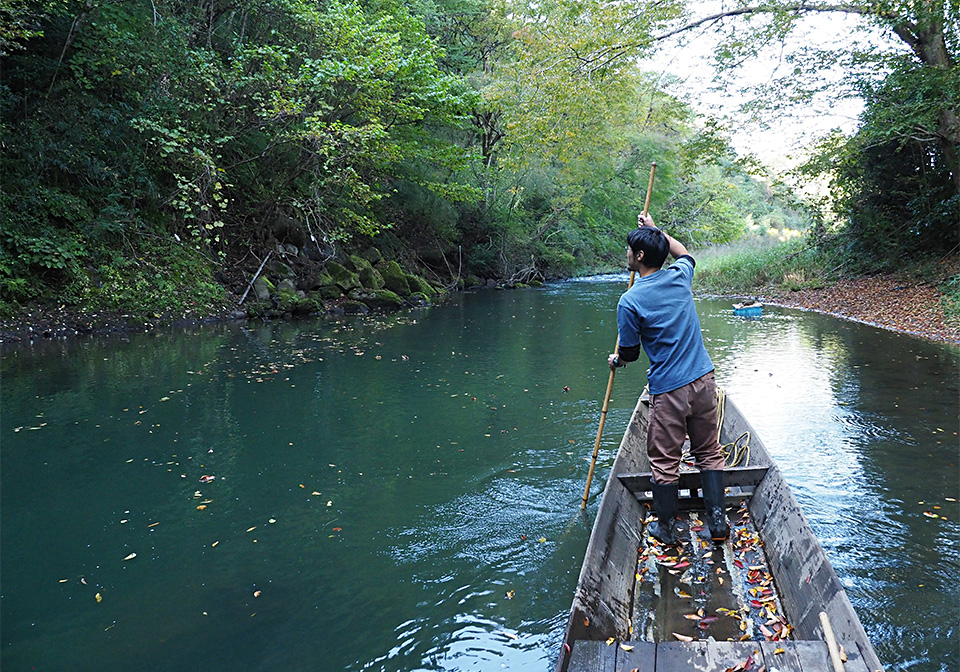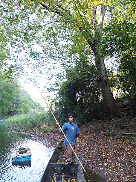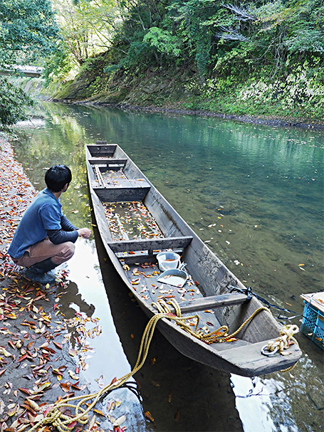 今年、年配の漁師さんから譲り受けたという和舟で対岸まで渡してくれた。動力は一本の竿竹。これで川底を突きながら進める。和舟は用途によって作りも異なるが、この舟は二人で投網を打っても安定するしっかりとした作りで、綱川さんは、アユの投網漁やウツボの設置に使っているという。来年はこの裏川を下り、本流へ漁に出るつもりだ。
