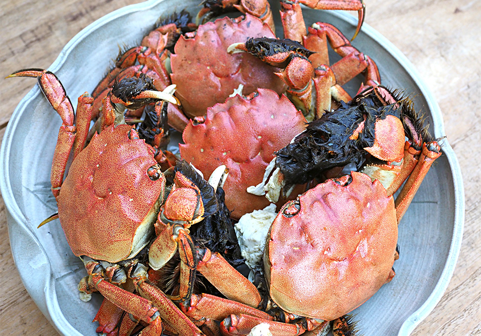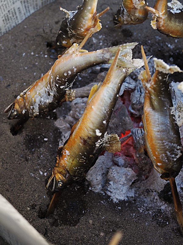 綱川さんが落ちアユに串を打ち、炭を囲んで焼いてくれた。アユは泳いでいる姿はもちろん、死んで焼かれてもなお、その美しさを保つ魚だ。張りつめた皮に包まれたむちっとした白い身が口の中で香ばしさとともに解ける。モクズガニは真っ赤に蒸され、大皿に盛られた。甲羅の隙間に親指を差しこんでパカッと開く。湯気とともにカニの甘い香りが立ち上がる。割った両面に詰まっている味噌を箸でほじくって口へ運ぶ。深い。とにかく味が深い。そして大きなハサミを割って中の身を食べてみた。甘い。思わず「甘栗みたいに甘いですね!」なんてよくわからない感想が口をついた。今考れば甘栗とは違うと思うが、とにかく驚くほどに甘いカニだ。モクズガニは初めて食べたが、忘れられない味となった。