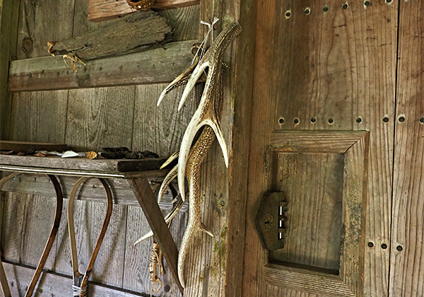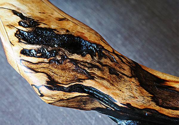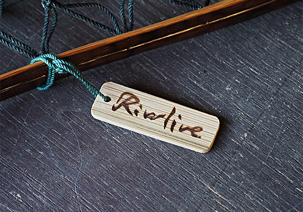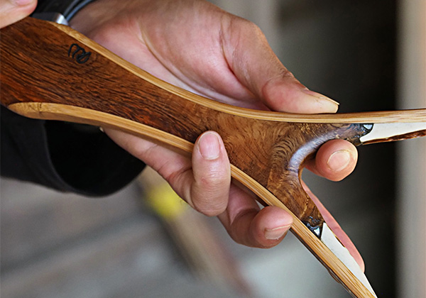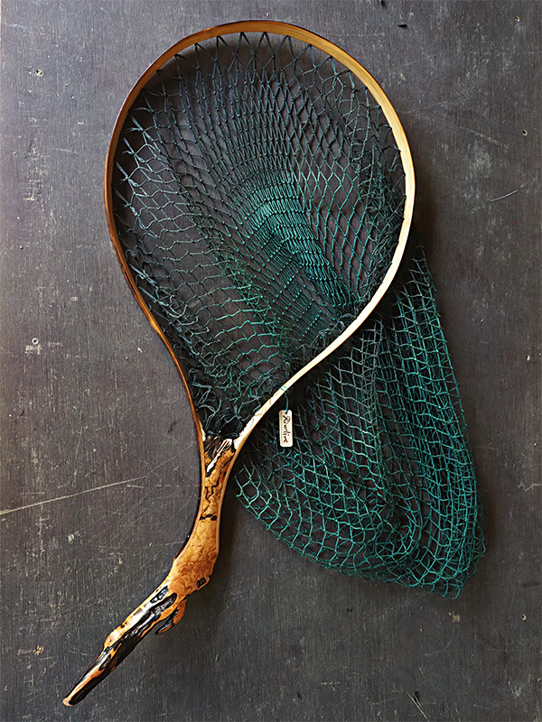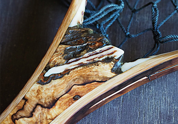 工房の一画に下がっていた「VINE(ヴァイン)」という名のランディングネットが目を引いた。那珂川を遡上するサクラマスや大型ヤマメを意識したサイズ。川の流れのような木目とツルの口ばしのようなグリップ。差し色として効いている墨色は、素材の流木が元々持っていた模様と色だ。材のへこみや穴に合わせて鹿角などが埋め込まれている。