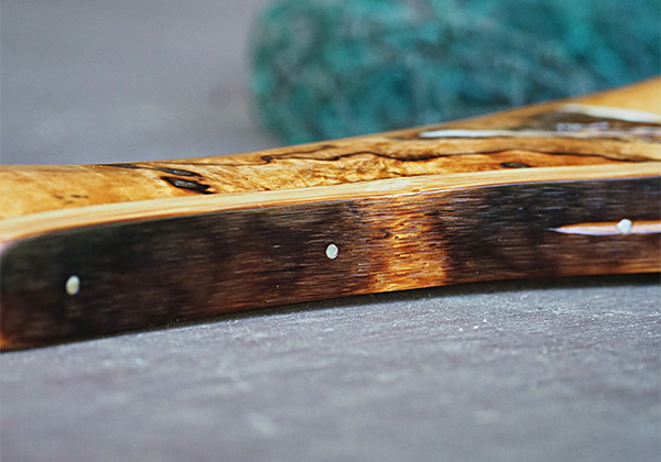 え?……と、二度見ならぬ二度聞きしたくなる素材を配したこだわりを次々と語る綱川さん。粘土はこの辺りの土で一度土器を焼き、それを砕いて削った粉を再利用しているという。グリップの横には直径2mmほどの円形の装飾が控え目に輝く。