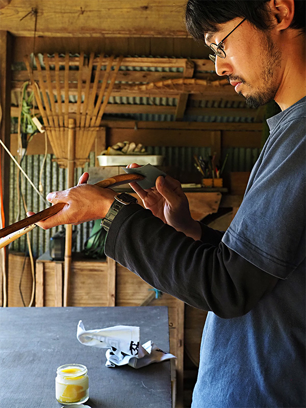 仕上げのオイルフィニッシュは、実家で養蜂するニホンミツバチの蜜ろうと茂木町の特産品であるエゴマ油を塗って磨き上げる。まさに那珂川水系原産というか、「好きなものばかり」と綱川さんが言う那珂川流域の素材を、好きなように思うように配し、全体のバランスとしては「自然に馴染む」ものとして成り立たせていく。話を聞いて、作品を見て、貴さを感じる。なによりこだわりを話す綱川さんの表情がいい。使ってみたい……と素直に感じながら、一方で自分のガサツな釣りを思い出す。でも、もしかすると、この道具を使うことで、自分の釣りの所作のほうが変わっていくこともあるんじゃないか。そんな楽しい妄想にふけった。