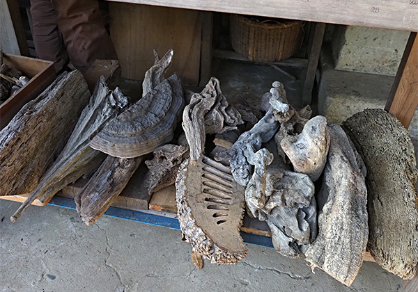 綱川さんの工房には、グリップとなる流木や材がたくさん転がっている。綱川さんが「なんかいいな」と思って拾い集めた物で、思い立てば手に取って、どのようなものにしたら材の良さを生かせるかを考えているという。