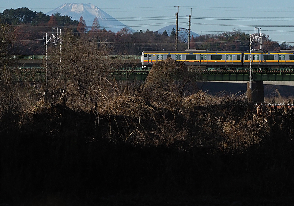 真っ青な青空。土手に上がると南武線のはるか向こうに富士山が見える。少し肌寒いが風はほぼない。小春日和とも言える好天気に恵まれたが、前回から1カ月が経ち、水の中の季節はだいぶ進んでいるようだった。