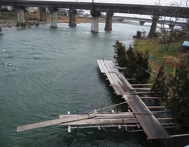 9時半過ぎ、大川の河口に到着。開けたドアがもぎ取られてしまいそうな強風が海から吹きこむ。川の上流を見ると山々が白くけぶっている。どうやら雪が降っているようだ。何カ所か、川筋に沿うように杉の木が並んで立っている。川原に突如現れる杉並木はとても奇妙な景観だ。強い風にあおられているが幹はしっかりと鉄パイプを組んだ足場に固定されている。その前方に箱状の枠がこさえられていて、枠の中に笹の束が漬けこまれている。おそらくはこれがコドなのだろう。それとは別に足場から突き出た竹竿も見える。竹竿の先から糸が水中へと伸びている。これは……なんだ?