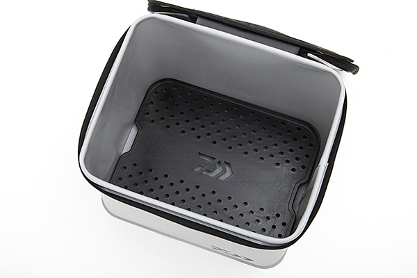 収納物が確認しやすい透明フタと、ハキモノ類から染み出た水を切りやすいスノコ付きを装備。開口部には型くずれしにくいフレームが入っており、汚水がシューズ類内に入りにくく、車載しやすい縦型形状。さらに、持ち運びに便利なトップハンドルが付いており、ウェーダーバッグにはショルダーベルトも付属。また、丸洗いできてお手入れが簡単なEVA素材。