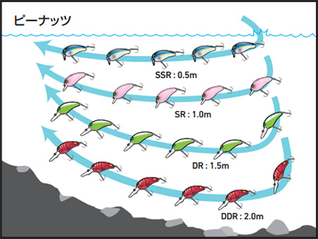 今までのピーナッツはSSR0.5m、SR1.0m、DR1.5mまでのレンジだったが、新たにDDR2.0mを追加。オカッパリやシャローでの船釣りにおいて、更に魚をサーチできる範囲が広がった。