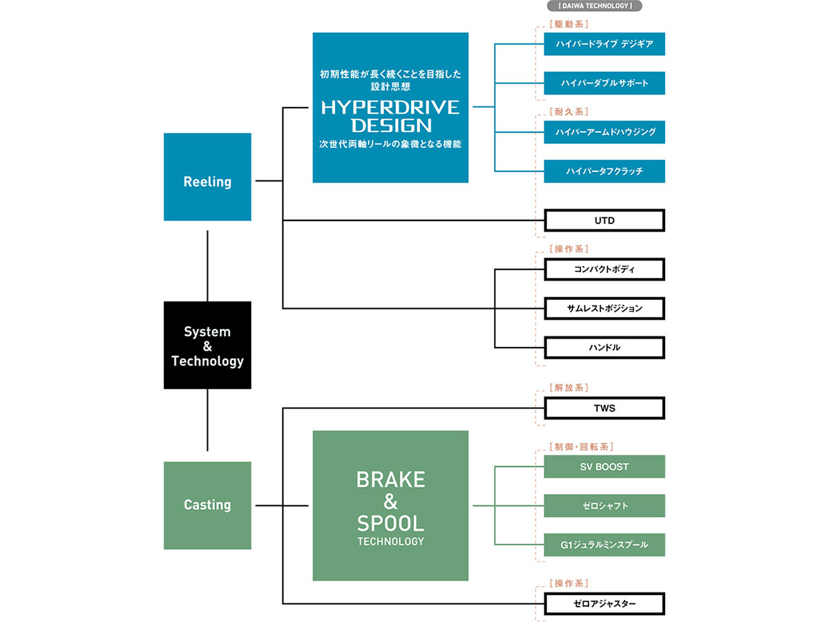 2021年に向けてDAIWAが打ち出したのはHYPER DRIVE DESIGNと呼ぶ、両軸ベイトリール設計思想。初期性能を永く維持すべく、4つの概念が紡ぐ優れた機能を徹底追求。次世代ベイトリールを牽引するモデルとして手がけた意欲作のひとつでもある。