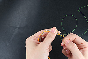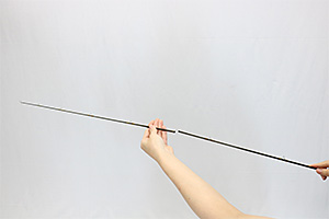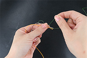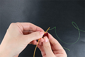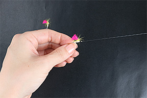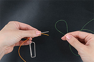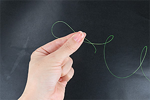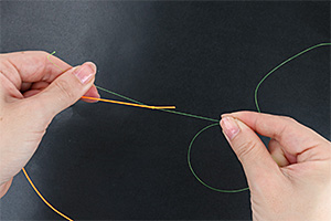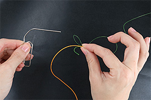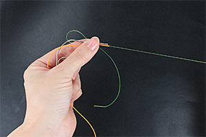 (2)フライラインに棒状のものを添えて折り返したリーダーと一緒に持つ。