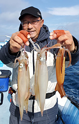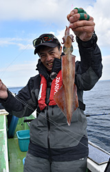 ヤリイカの待つフィールドに向けて出船。早く使いたいと言う気持ちをグッとこらえて航程1時間の洲崎沖に到着です。この日の仕掛けは、ブランコ仕掛けの7本角。オモリ120号をセット。オールラウンダーの8:2調子で実釣スタート!軽さ・感度・グリップ感は如何なものか?水深150メートルで仕掛け着底、糸フケを取りシャープなシャクリで小魚(ベイト)が逃げ惑うイメージでシャクリ開始。シャクリの合間に、アタリを確認する待ちの時間を入れると、「クッ」と穂先にイカらしいシグナルが到来。8:2調子の目感度も最高に分かり易い!繊細なアタリ(触り)を感じ取る事はイカロッドには欠かせないのである。実釣中のイカ釣りは、常にシャクリ・待ち・シャクリ・待ちの繰り返しである。様々なターゲットの釣りの中でも体力勝負のイカ釣りのイメージが強いが、今回から極鋭ヤリイカにも採用された【ZERO_SEAT】は一日中シャクリ続ける釣りの体力消耗を軽減。シーボーグ300シリーズとの組み合わせで快適なヤリイカ釣りが楽しめると思います。