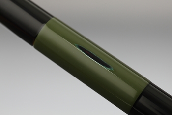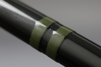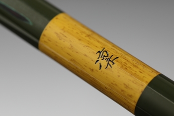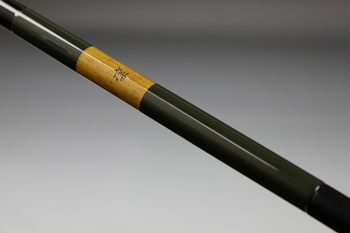 漆黒の本体色に緑の段塗りを施し、そこに見える研ぎ出しが味わい深い趣を生んでいる。竿掛は4通りの組み合わせで幅広く対応。