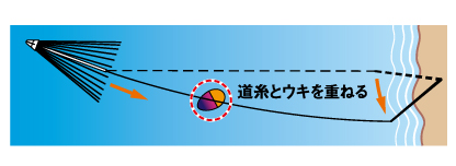 ウキトリパラソルをウキよりも遠くに投入し、ロッドを立てゆっくり水面を引く。その際、道糸とウキが重なるようロッドを左右に倒しながら引くと、ウキがすくいやすくなる。