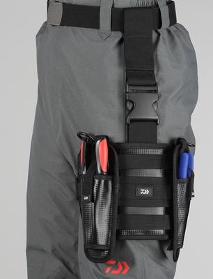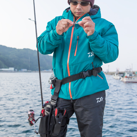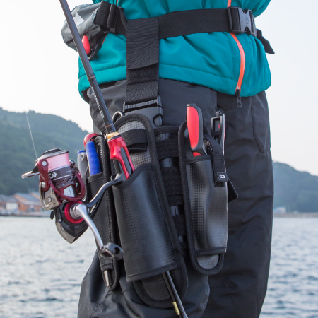 足にギアを集約させるホルスターは肩を解放し、感度が求められる釣りでより集中できるように設計。太腿で固定するタイプなので、機動力にも優れている。ユーザーは自由にカスタマイズが可能で、iPhoneケースや月下美人モバイルワレット、ロッドホルスターなど、様々なアイテムの取り付け可能。さらに、別売りのフィッシングベルトにもセットができ、お気に入りのタックルを身に着けて、身軽で手軽な釣りを楽しめる。