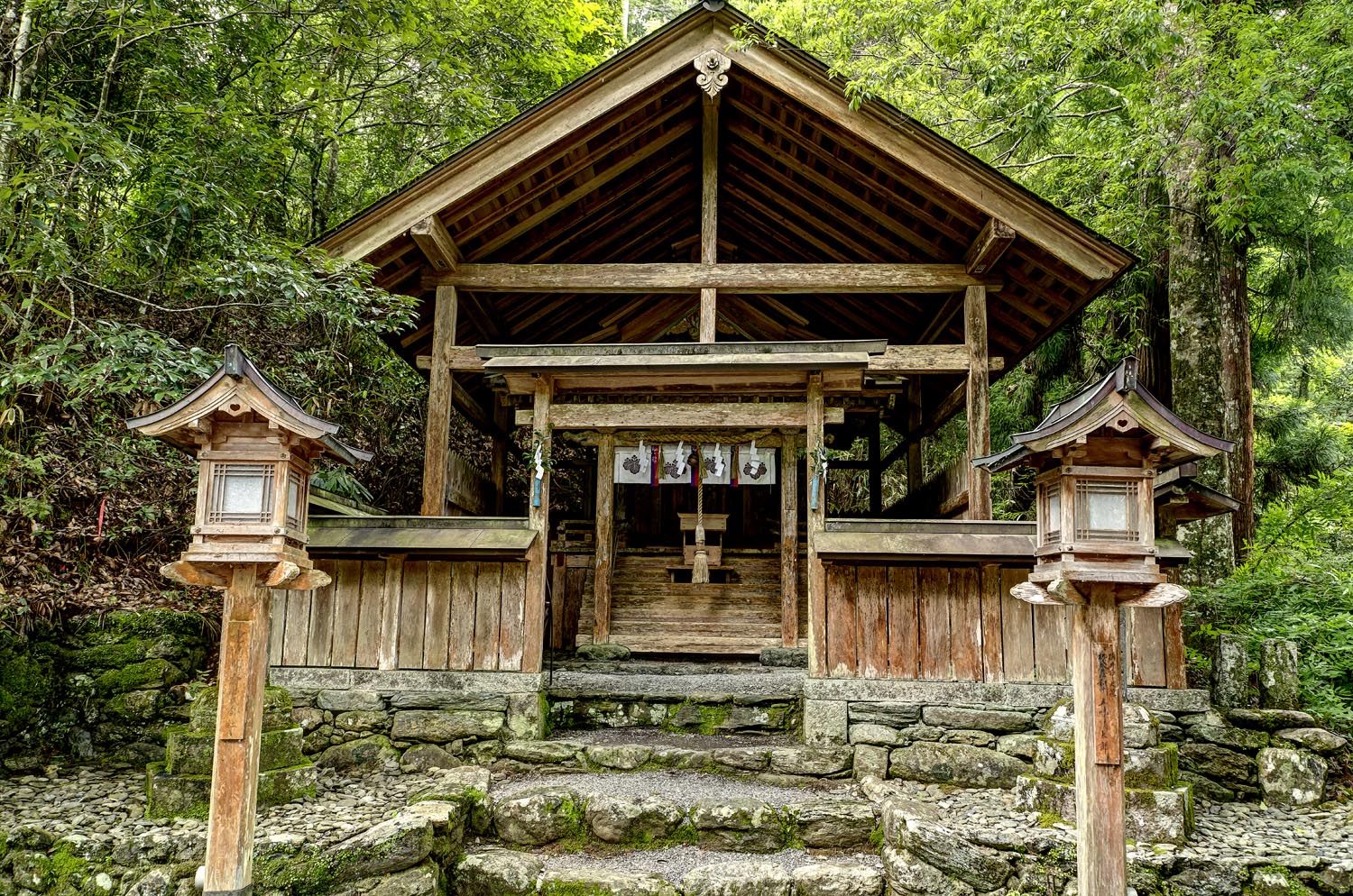 木々に守られるように建っている丹生川上神社。威厳のある佇まいに迫る力を感じる。