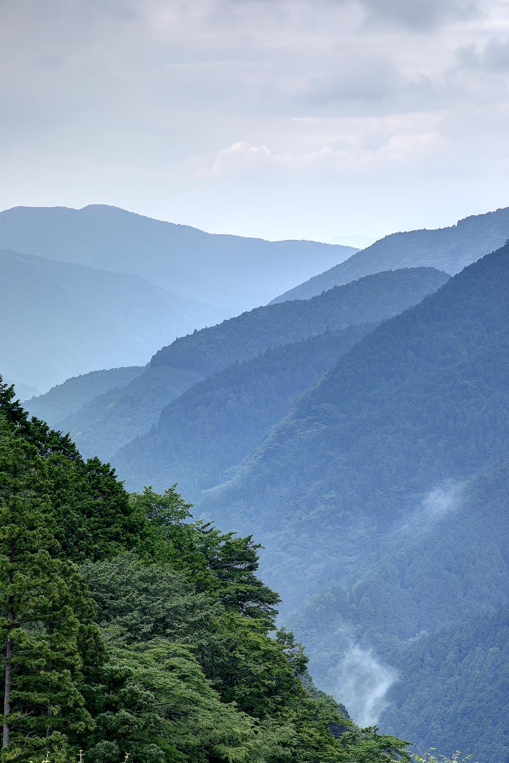 総面積の95%を山林が占める川上村の朝。東の稜線から顔を出したばかりの太陽に照らされながら、山道を車で走る。吉野杉は日本三大人工美林に数えられるだけあって、窓から見える林はとても美しい。車を止めて、道路脇の美林を仰ぎ見た。
