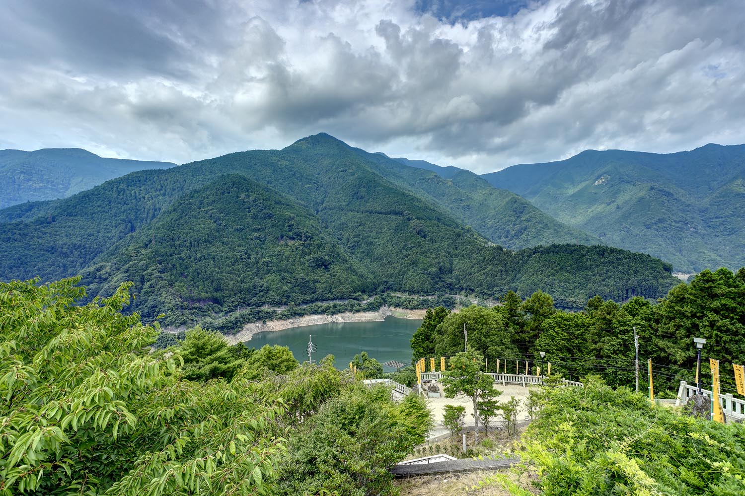 水の神様を祀る丹生川上神社上社より。大滝ダム建設を機に高台に移った境内からはダム湖が一望できる。