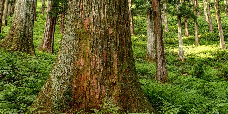 スギもヒノキも、ひたむきに天を目指すかのように上へ上へと伸びている。その幹は根元と上部までほぼ同じ太さで、節がなくまっすぐだ。木はどっしりと太いのに、木と木の間が十分に空いているから、林の中がとても明るい。リズミカルに立ち並ぶ木々の間から差し込む真新しい朝日が、林の中に光の柱を立てる。大人が二人がかりでやっと抱えられるというほど太い木は、樹齢約250年の杉だという。