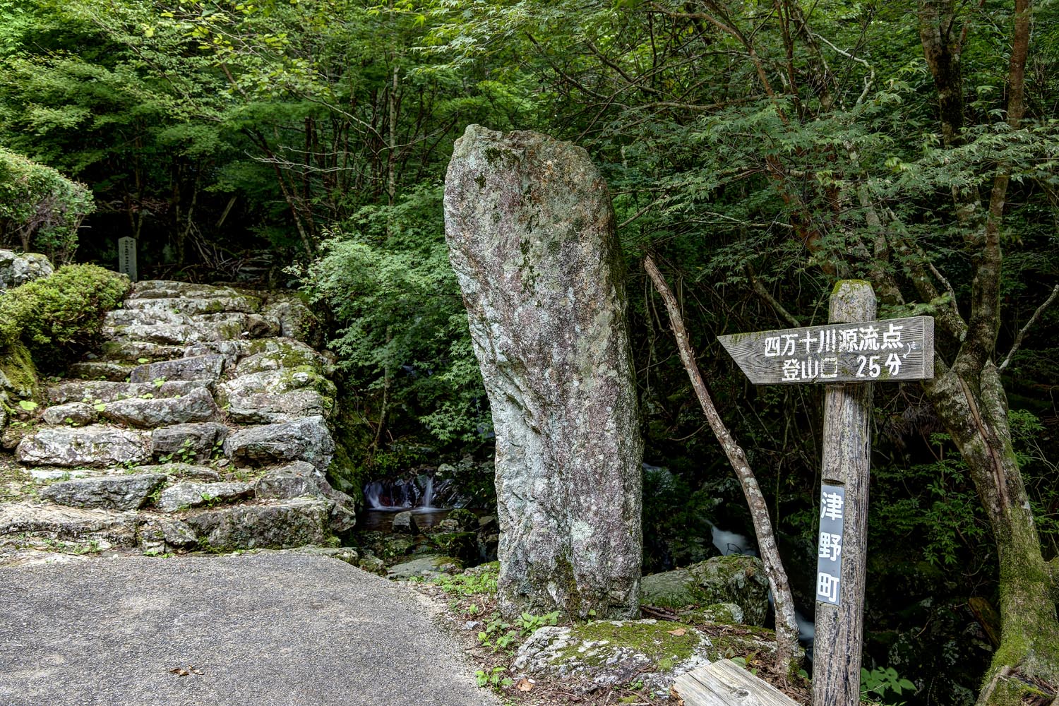 「はい、到着しました」と谷脇さんがトゥクトゥクを停めた目の前の大きな岩には、「四万十川源流之碑」の文字。ここは、四万十川源流点までの登山道のスタート地点なのだ。すでに標高は900mあり、源流点では1,010mになるという。